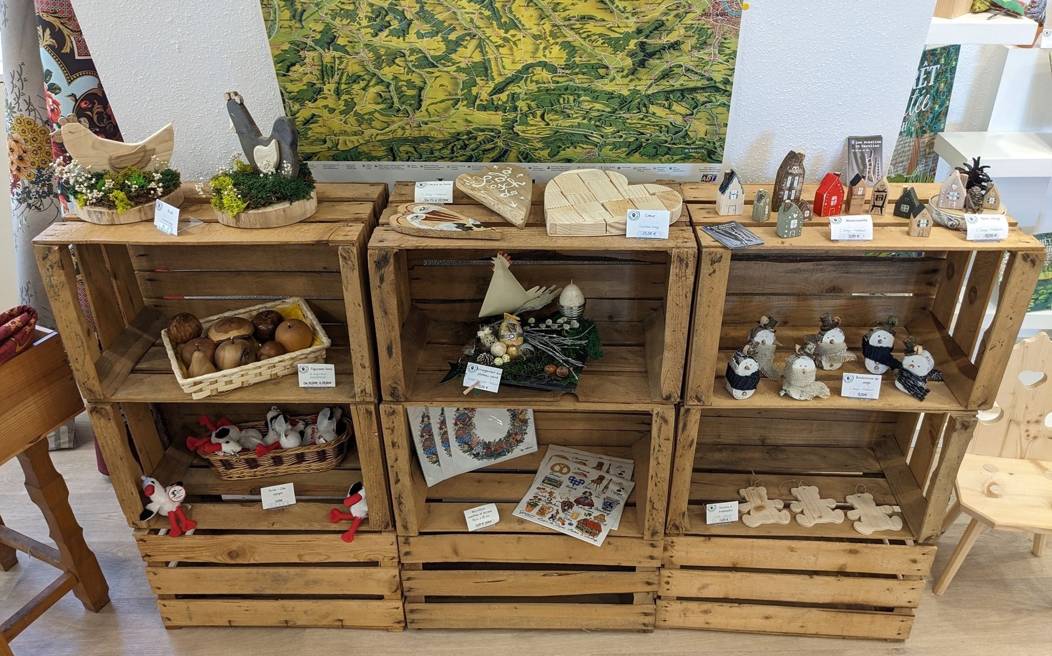 La boutique de l’Office de Tourisme s’étoffe régulièrement et nous proposons aujourd’hui 345 références ! Affiches, cartes postales, cartes de randonnée ou de VTT, topoguides, T-shirts, accessoires, souvenirs, produits en kelsch, mais aussi objets artisanaux en bois, en céramique ou encore en feutrine. Notre volonté est de mettre l’artisanat et les produits locaux à l’honneur.